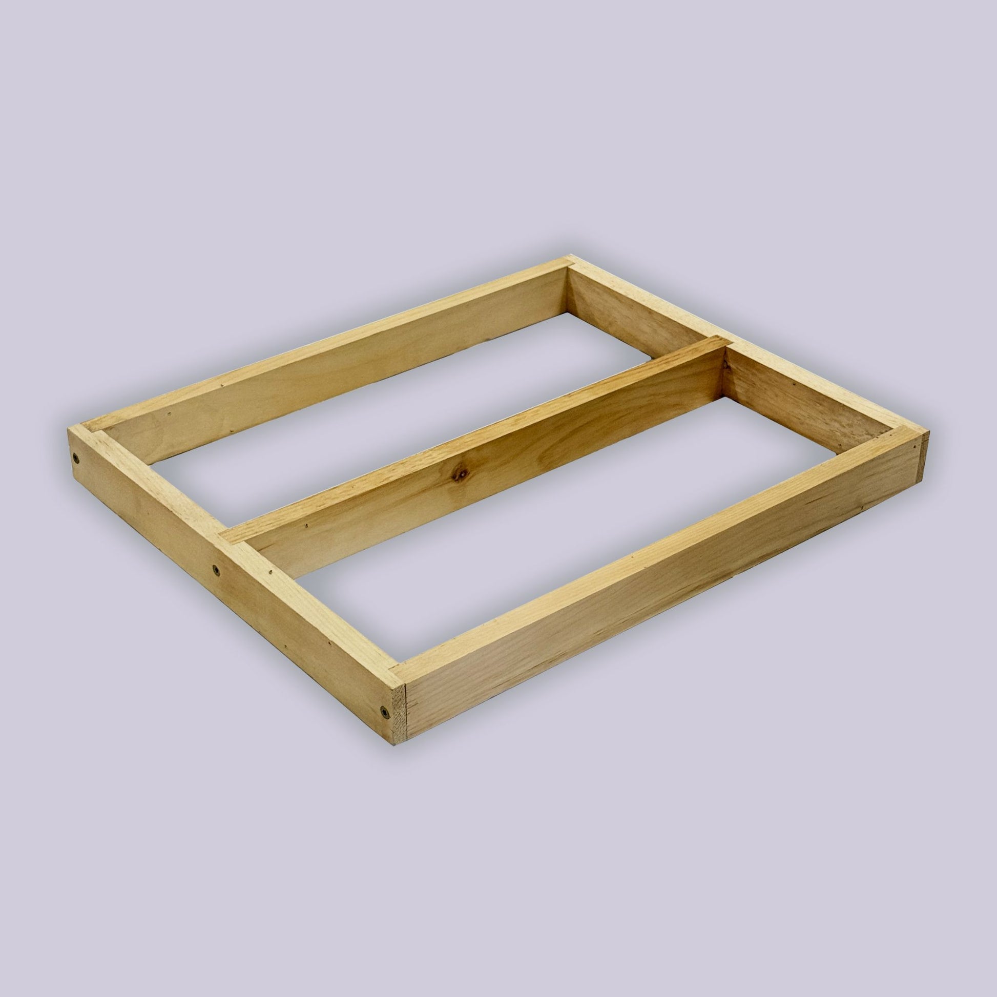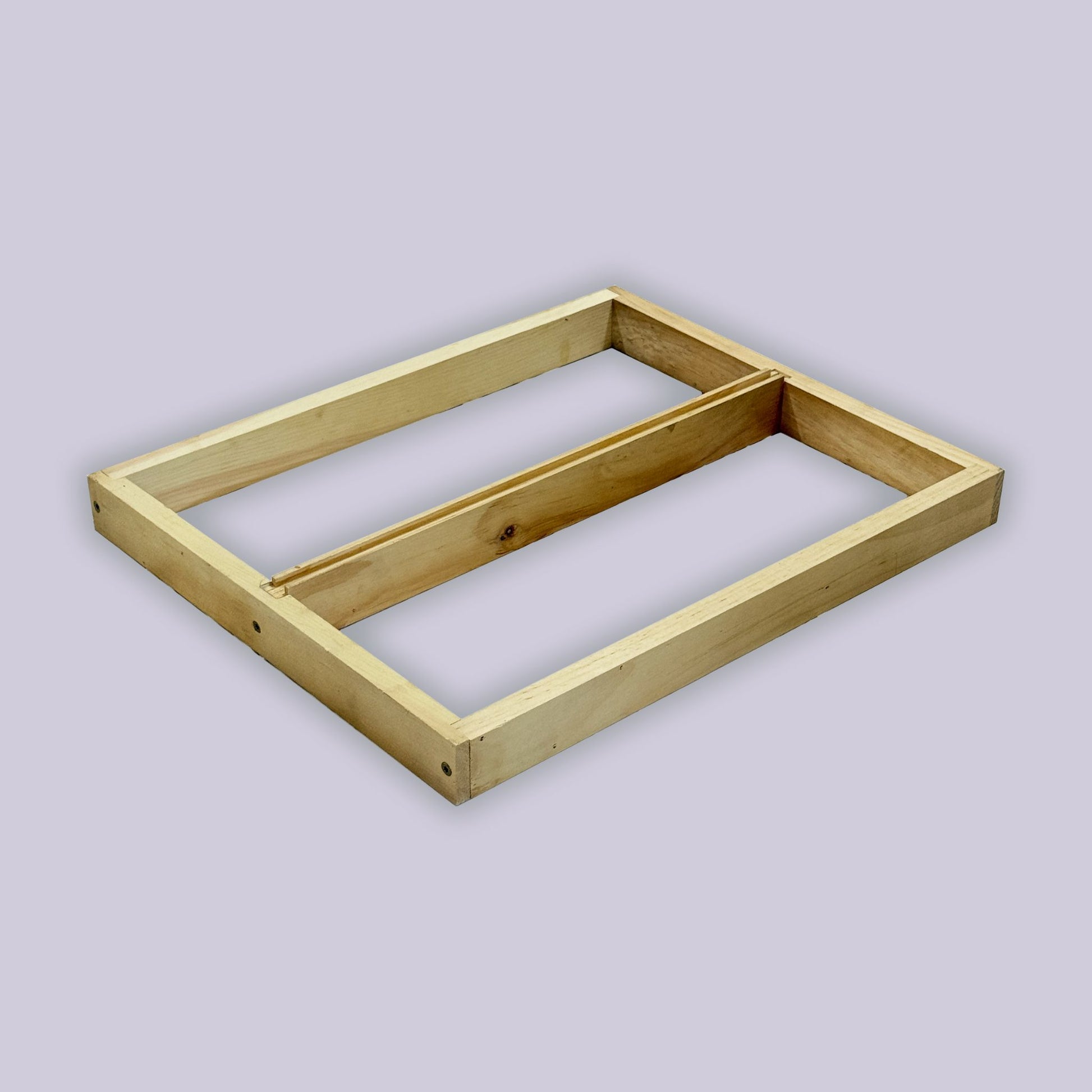 The Two Queen Keeper Feeding Shim is designed to go on top of the divided "spacer box" (a reference to the Demaree method of swarm control) and provide beekeepers with a space to place fondant, sugar bricks, and other winter feed on top of the frames. The central dividing strip on the feeding shim has a notch cut into it that rests on top of the divider wall in the spacer box, ensuring that both colonies stay completely separated.